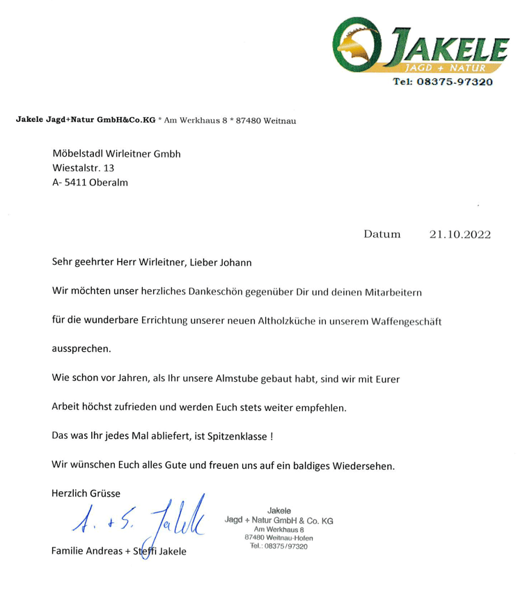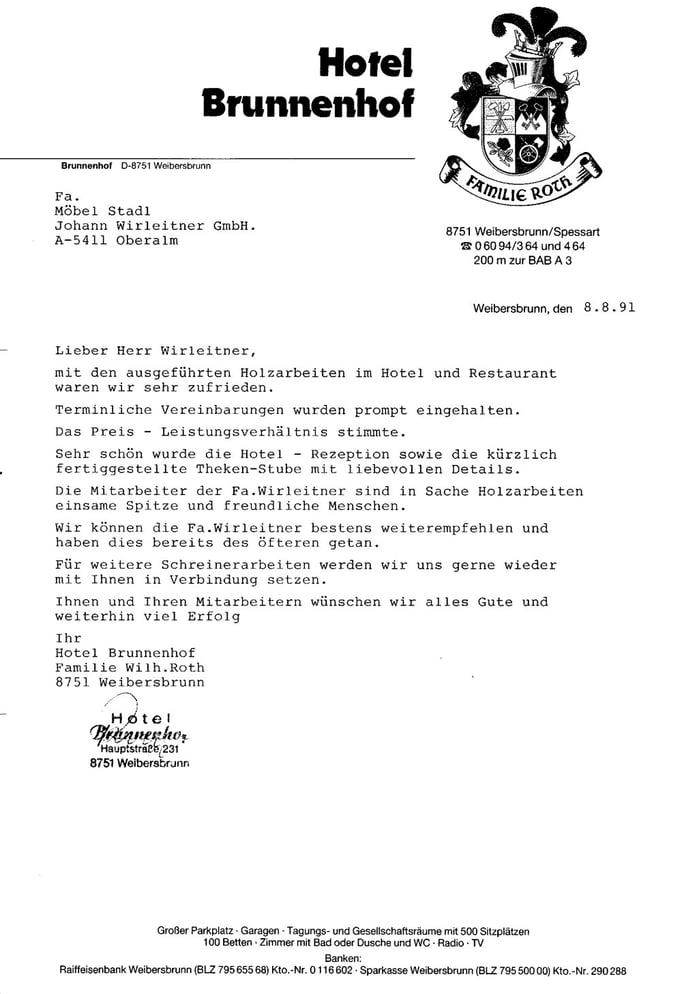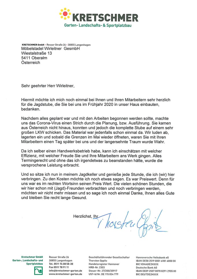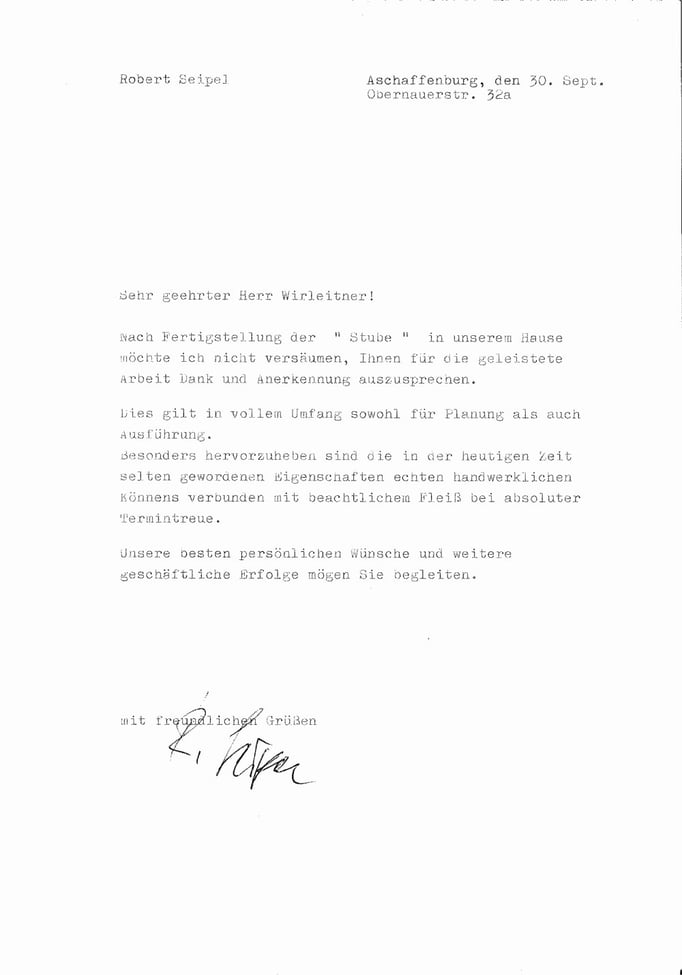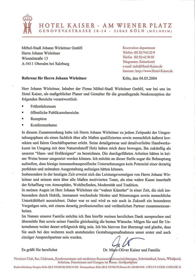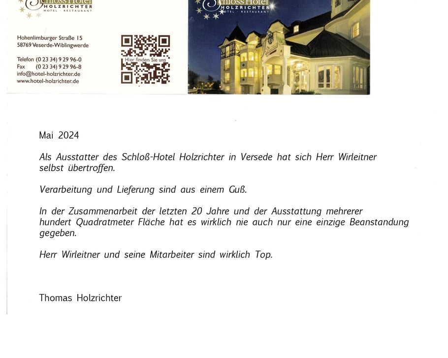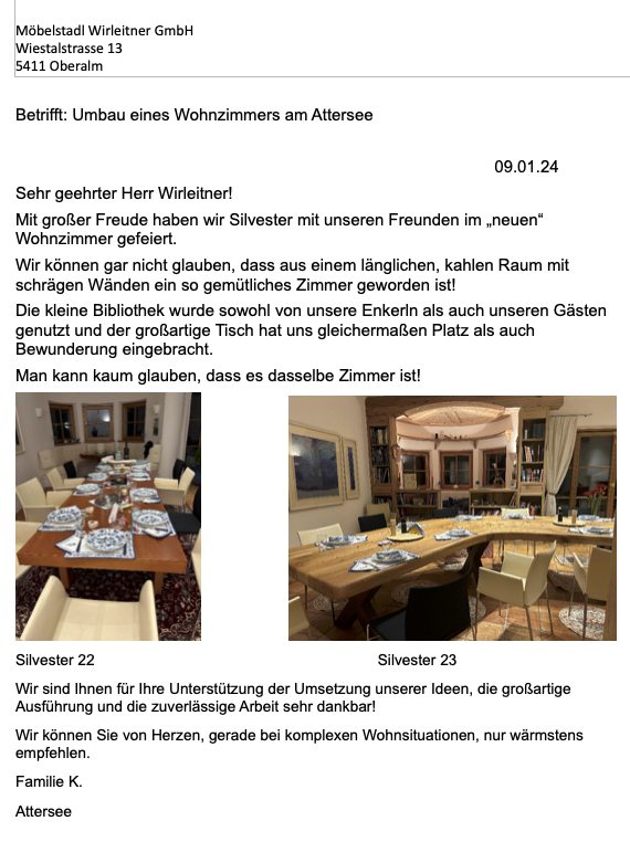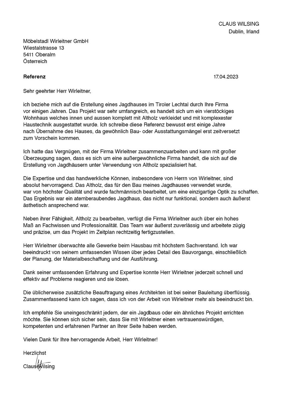 Referenzschreiben für Tischlermeister Johann Wirleitner September 2023