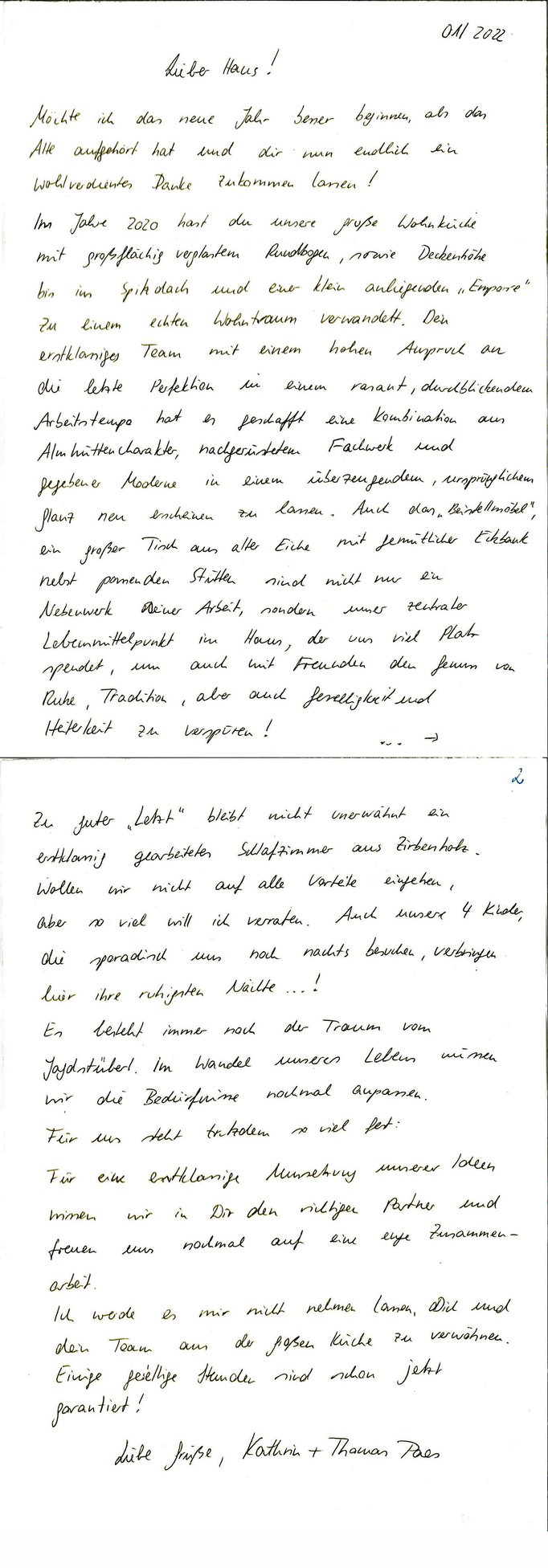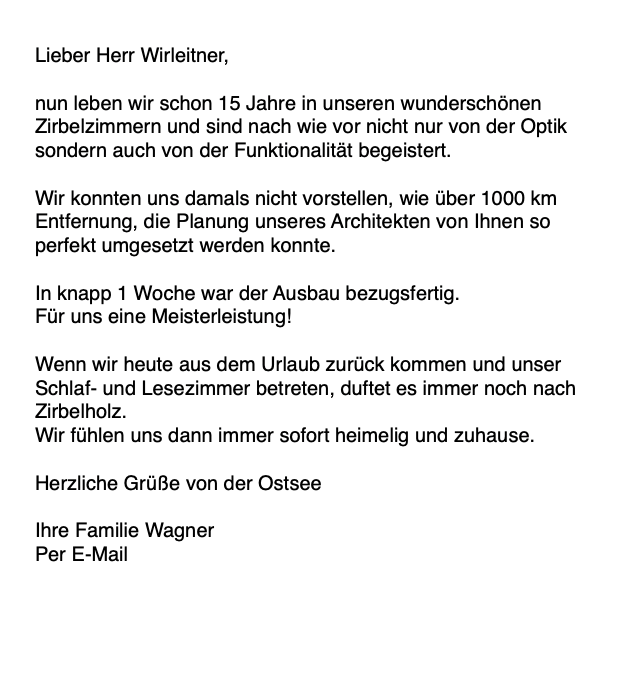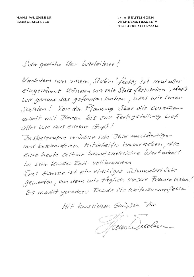 Sie waren bei Ihren Tätigkeiten für uns immer ein Garant für exzellente handwerkliche Arbeit, Verlässlichkeit, Ideenreichtum, tolle raumgestalterische Problemlösung und kulante Servicearbeit.