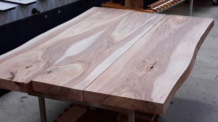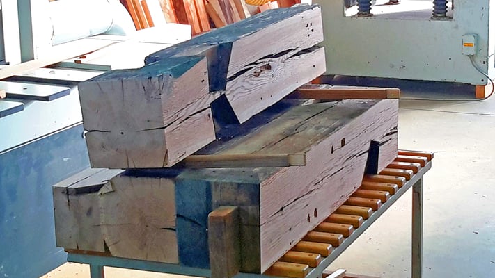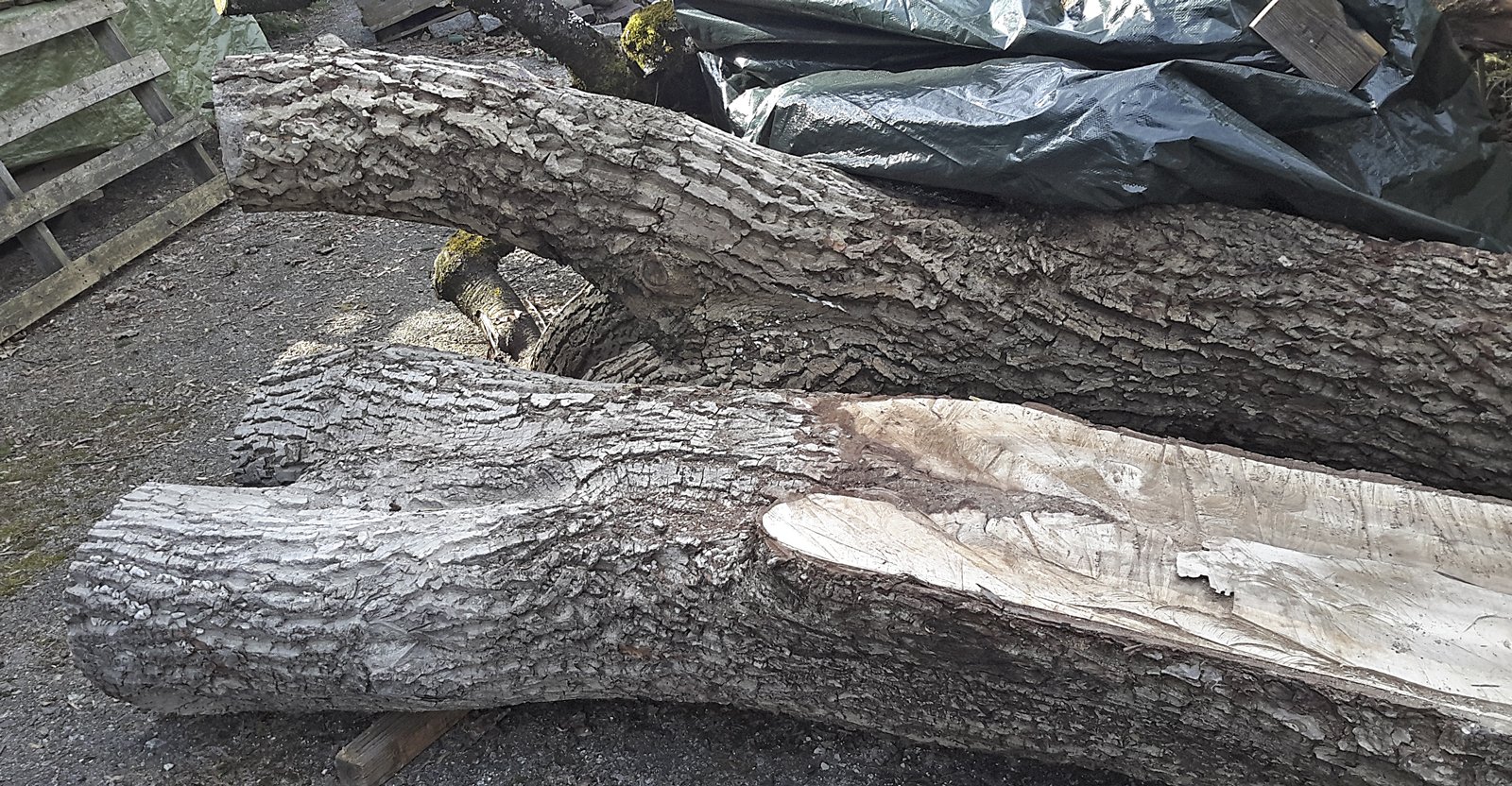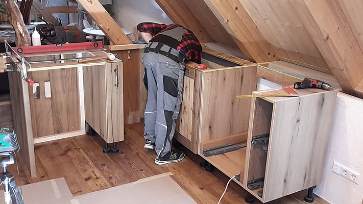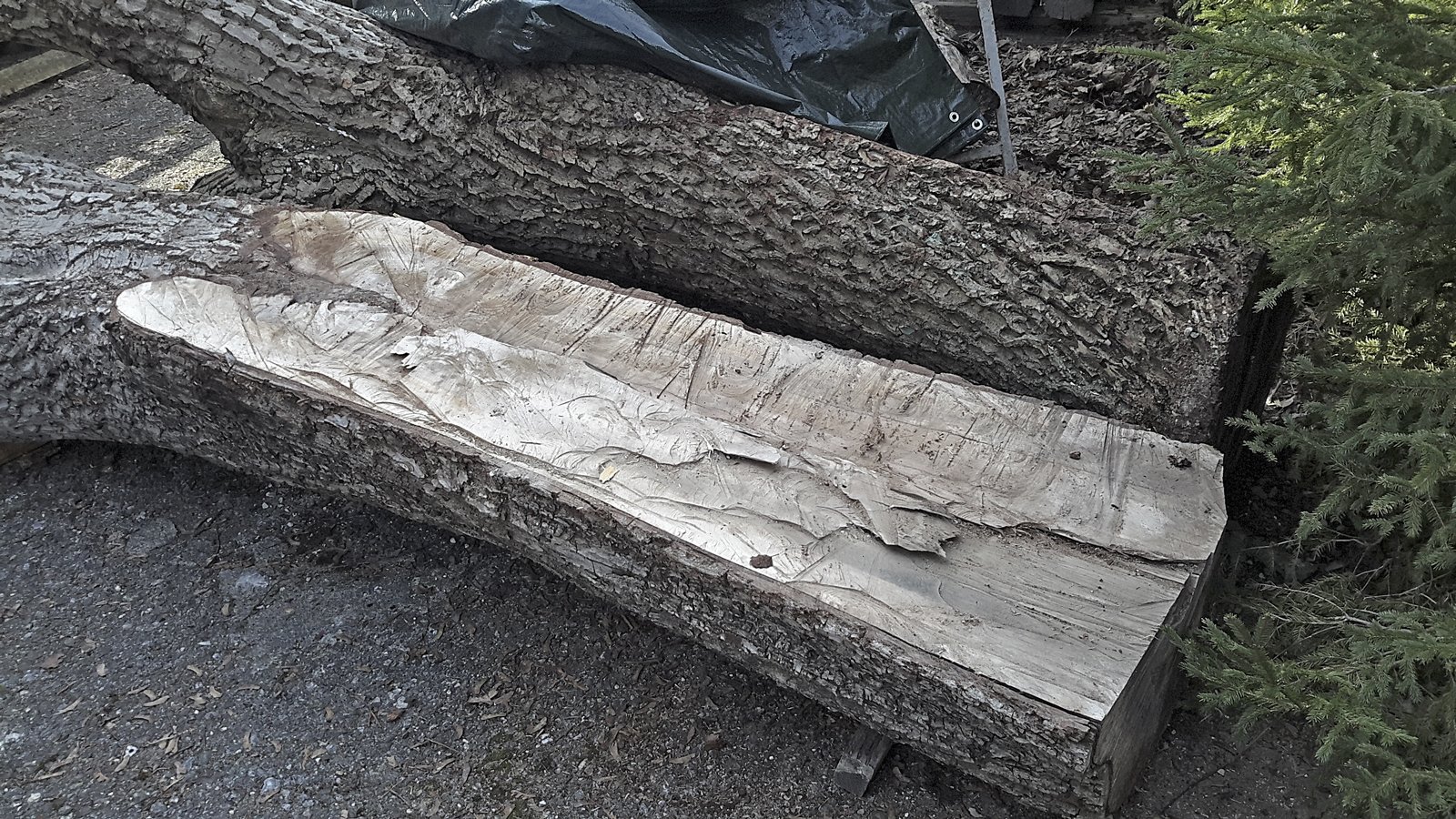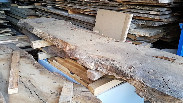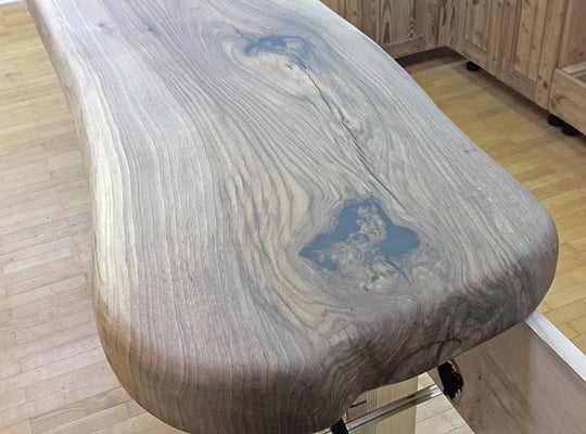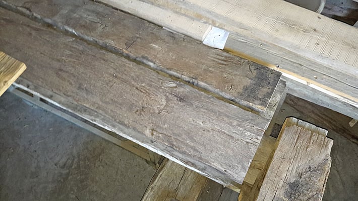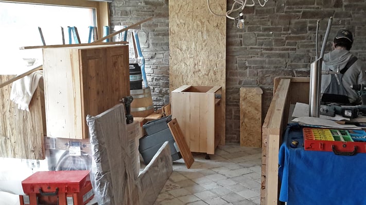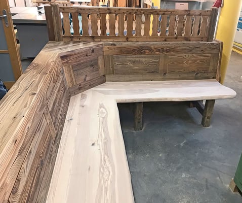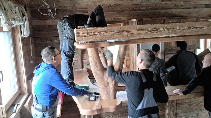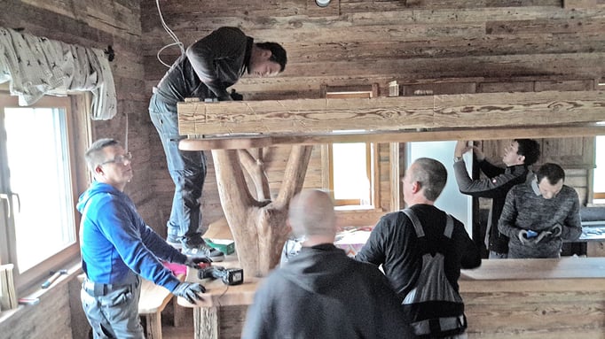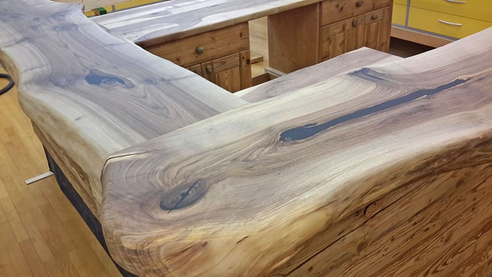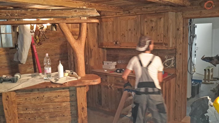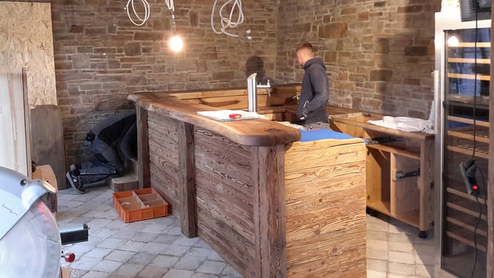 Und wir bauen eine Theke mit einer ganz besonderen Holzauswahl, Nußholz kombiniert mit Tannen-Altholz.