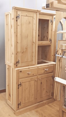 Dahinter steht eine Geschirr- und Gläser-Vitrine aus Zirbenholz, ebenfalls auf Maß angefertigt: