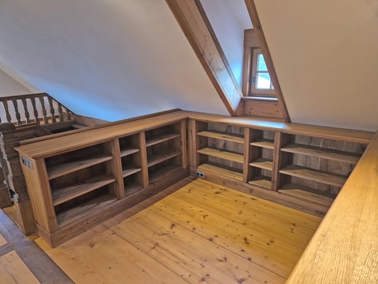 Den Waffentresor verkleiden wir mit Altholz, ebenso eine Garderobe und den Wäscheschrank und ein Bücherregal für etwa 1000 Bücher.