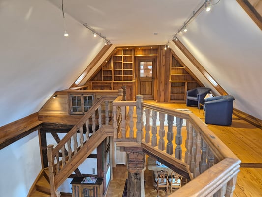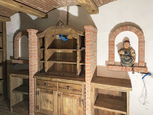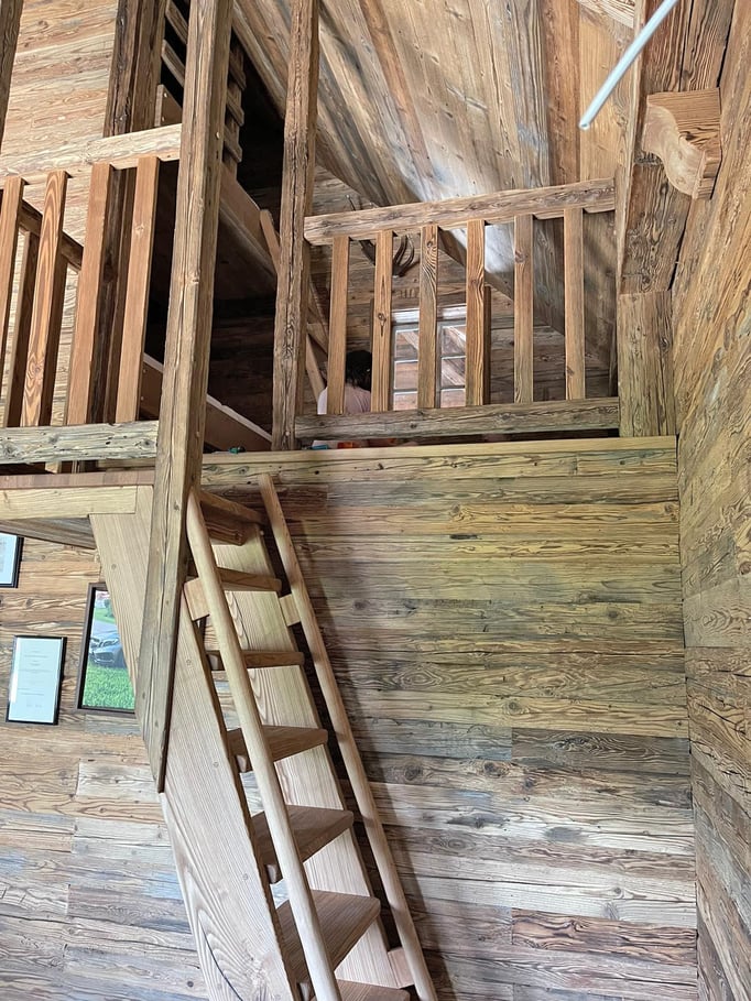 Wir haben natürlich wieder alles aus unseren besten Althölzern auf Maß und nach Kundenwunsch angefertigt, geliefert und montiert - auch die Beleuchtung und die Vorhänge an den Fenstern.