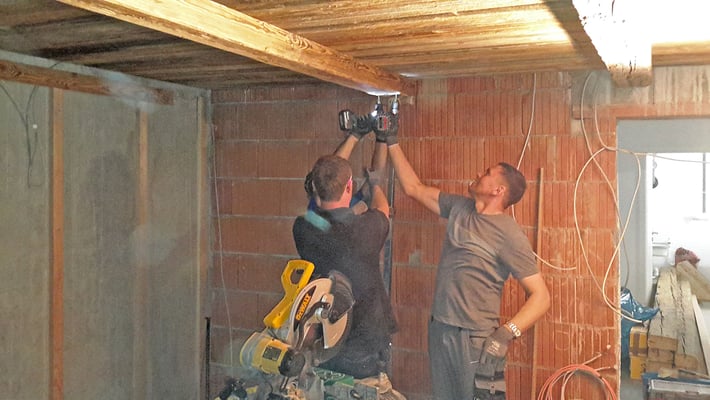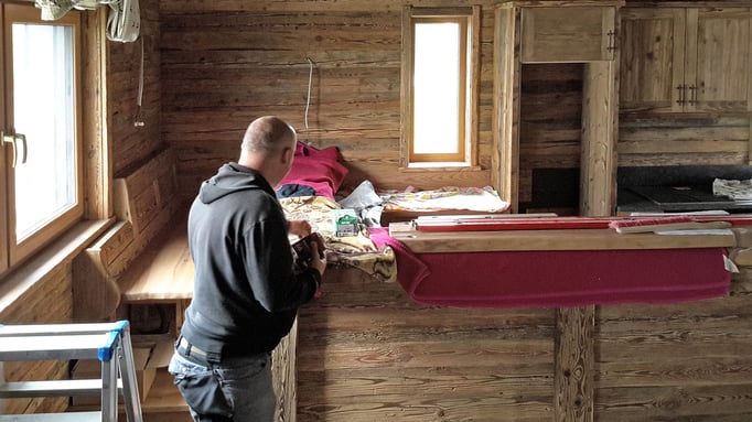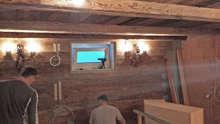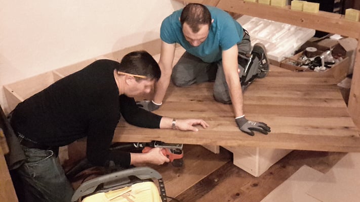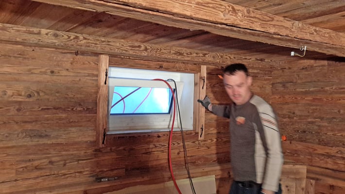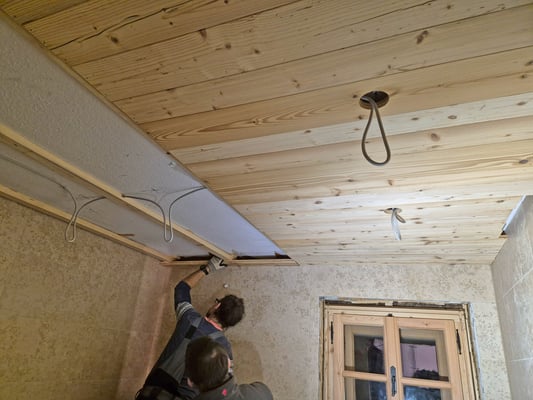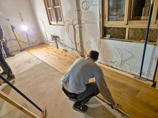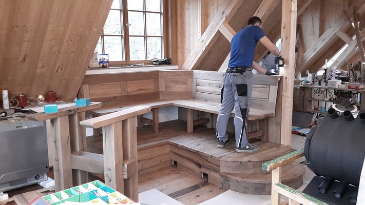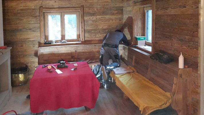 Jetzt im Dezember wurde der Eichen-Dielenboden über der Fußbodenheizung verklebt, die Decke wurde montiert - die Altholz-Zirbenstube ist nun fast fertig: