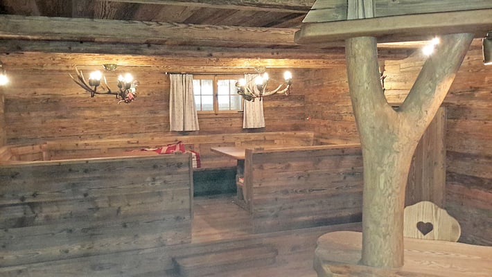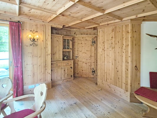 Die fix und fertige Stube aus unserem herrlichen Altholz, ergänzt mit passenden Hängeleuchten über den Tischen, Wandlampen, Sitzkissen, geschmiedeten Vorhangstangen und passend genähte Vorhänge an den Fenstern.
