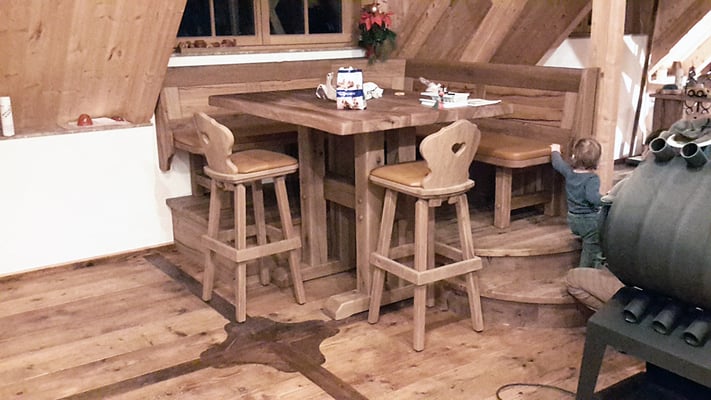 Für ein Privathaus in Deutschland haben wir aus original alten Eichenbalken eine Sitzbank auf einem Podest mit zwei Stufen, mit Lederpolsterung am Sitz, einen Hochtisch mit Nussplatte und zwei Hochstühle angefertigt.