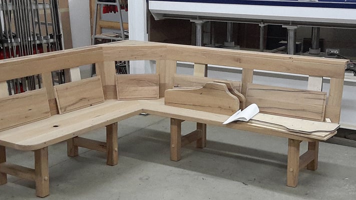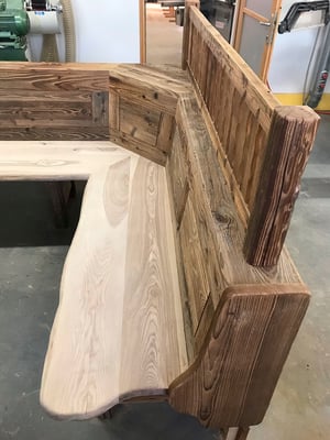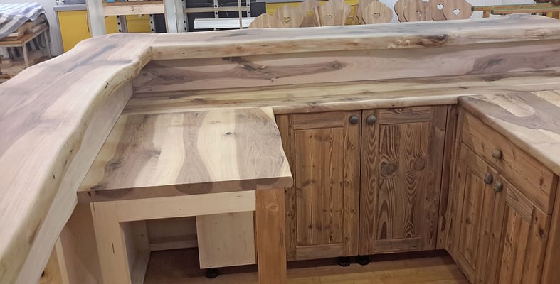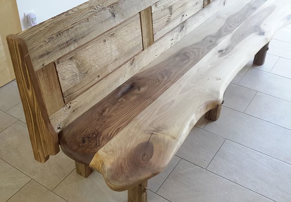 Die Barplatte und die Tischplatten fertigen wir aus uriger Esche, ebenso die Sitzbänke, die Barhocker und die Stühle.