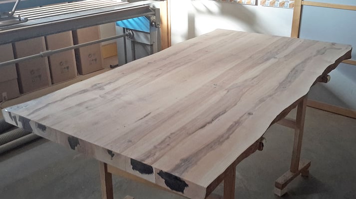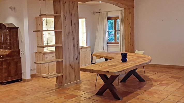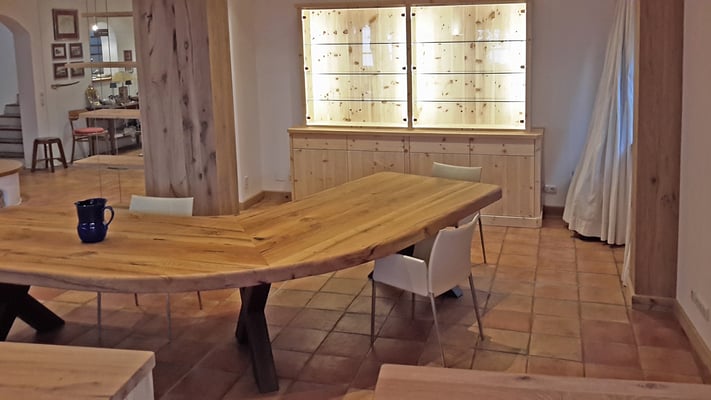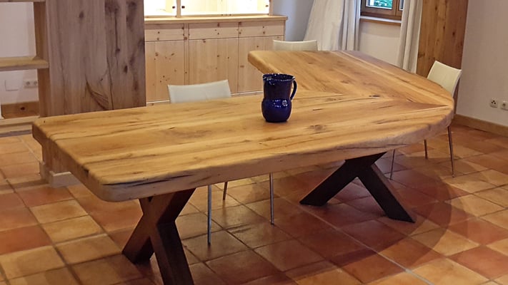 Für eine Villa am Attersee haben wir einen ganz besonderen Tisch in Nierenform aus orignaler alter Eiche mit Goldadern und Metallgestell angefertigt.