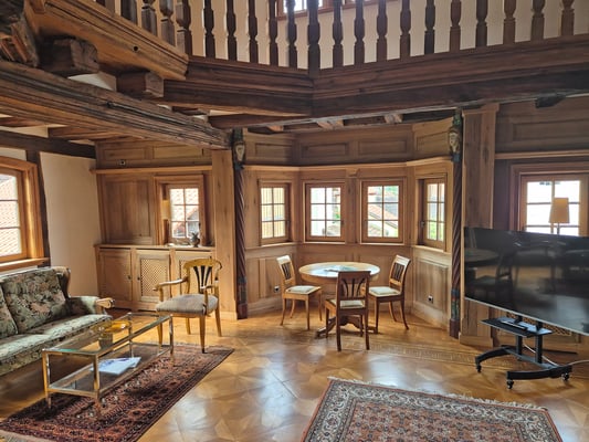 Der Wohnraum aus alter Eiche, kombiniert mit Antiquitäten - Schränke, Tische, Stühle, Kachelofen, etc.