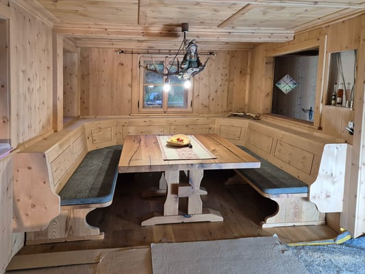 Für die Bänke fertigen wir lose Sitzkissen mit jagdlichem Dekor an und wir bringen Jagdbilder und diverse Trophäen von Hirsch, Gams, Rehbock und vieles andere mehr mit, wenn wir dann die Stube montieren.