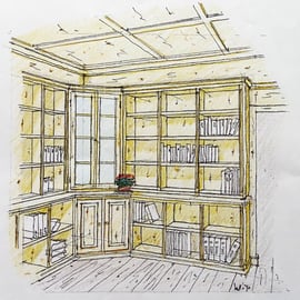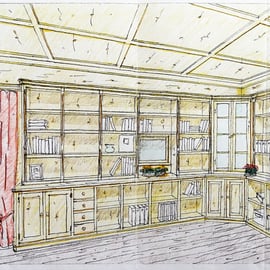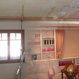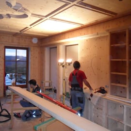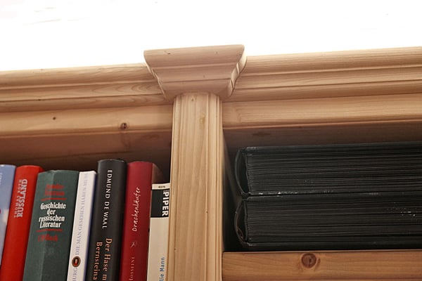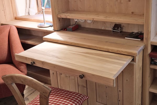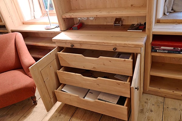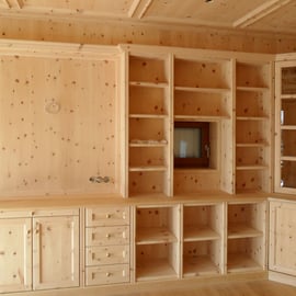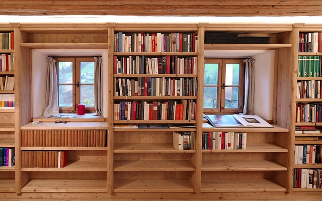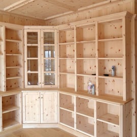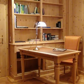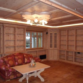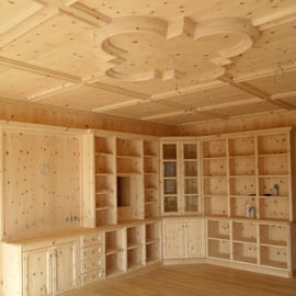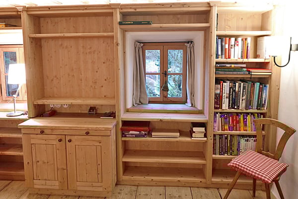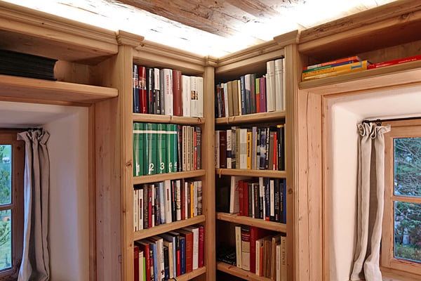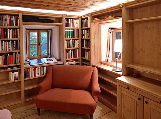 Ansichten dieser Bibliothek aus duftender Zirbe, die auch ein Multifunktionsraum ist.