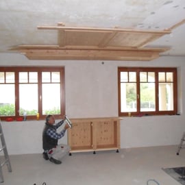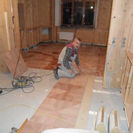 Der Boden ist aus Kirsche, als Sternparkett ausgelegt